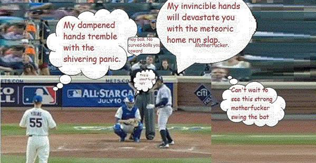 This spring, however fleetingly, he turned his attention to our national past-time. Frankly, it was the best baseball writing on the web this week or this year. He started out with surrealist baseball-inspired poems, koans, and acrostics, lapsing sometimes into proto-fascistic sloganeering, but after a couple of days, he started to find the voice of the ‘Mr. Baseball’ character: an anthropomorphic baseball who detests pitchers and all that they stand for, who reveres the powerful, muscular “slugger” archetype as a Nietzchean superman. And is also kind of a hardcore Zionist. Though the handle and display name have changed, the tweets are still up: